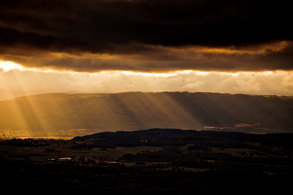 Der Lichtstrahl unten links der Sonne, und die Regenbogenfarben unten links und rechts in den Ecken.