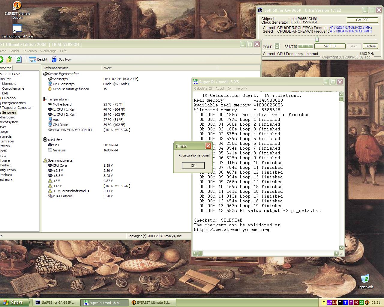Einfach schnell FSB hoch und SuperPi1m laufen lassen und das kam dabei raus, hab nichts optimiert, nur FSB hoch und los: