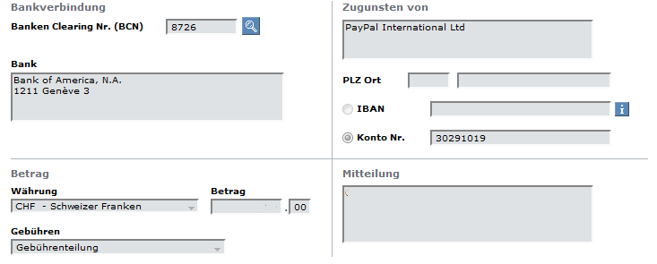 Unbekannte Kontonummer und Adresse sowie PLZ/Ort von Begünstigter benötigt.