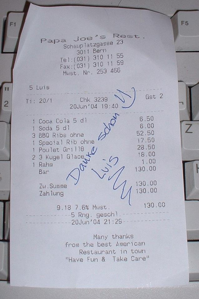 er hatte 1 ganzes Poulet mit Eisbergsalat und 1x Ribbs ohne Beilage. ich hatte 3x Ribbs ohne Beilagen ![]()