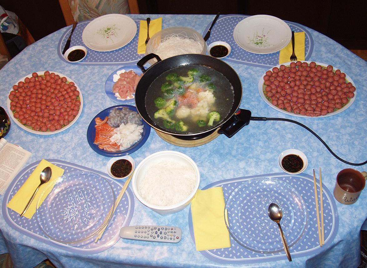 man tut halt das Fleisch und Nudeln (nie zusammen) in so ein kleines Körbchen mit nem Griff und tuts ins Bouillon, ums zu kochen.