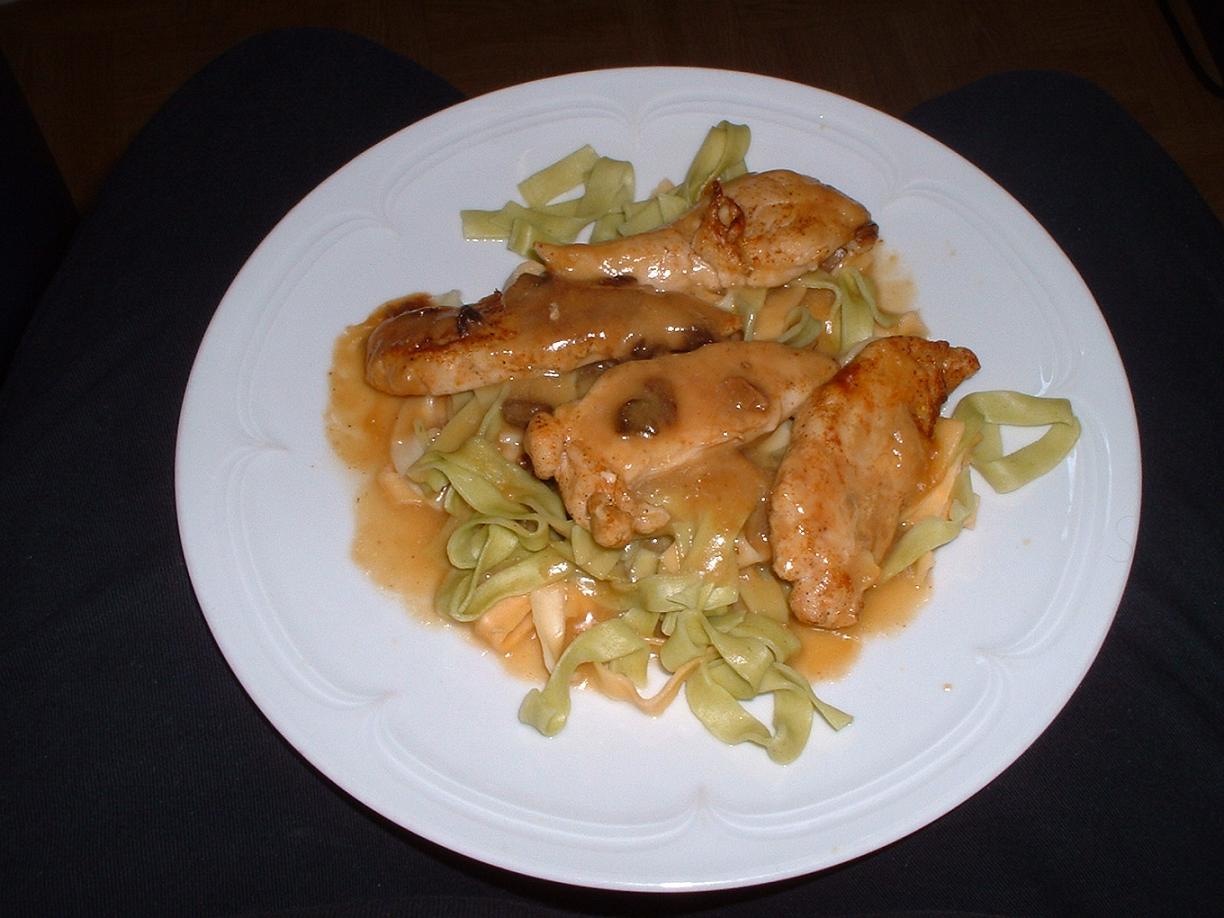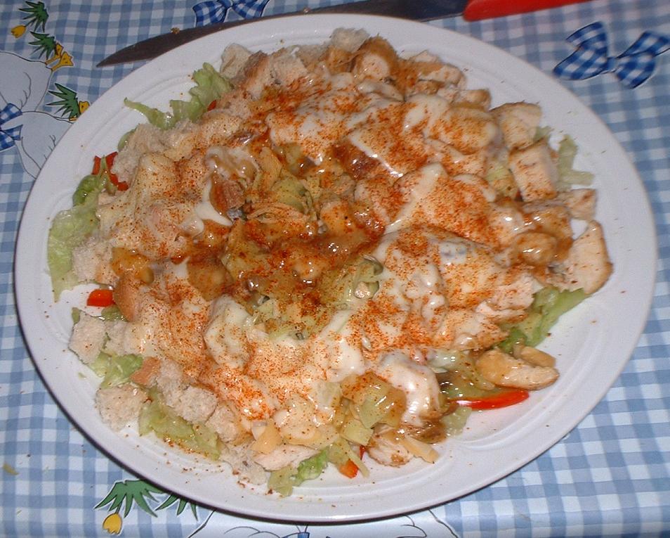 - 2. dann paar Dinge zusammensuchen wie ne Scheibe Brot, bissl Poulet-Brust und paar Nudeln. dieses verkleinern und dann schön auf dem Salat verteilen