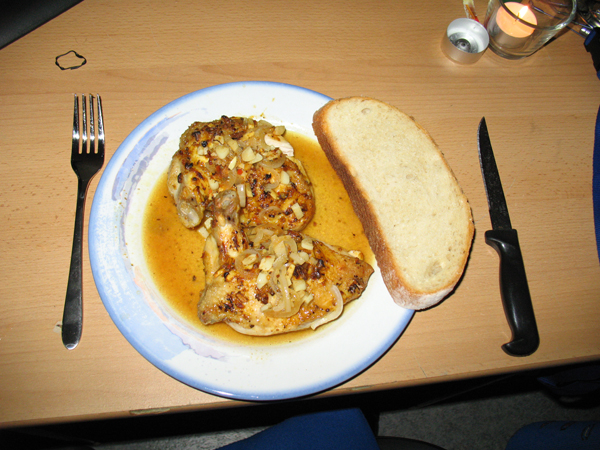 Im Ofen bei 300 grad backen (zwischendurch mit Bier übergiessen). Nicht zu lange, nur bis sie Farbe haben. Danach den Ofen ausschalten und das Poulet ziehen lassen. Hmmmm leggaaaaa