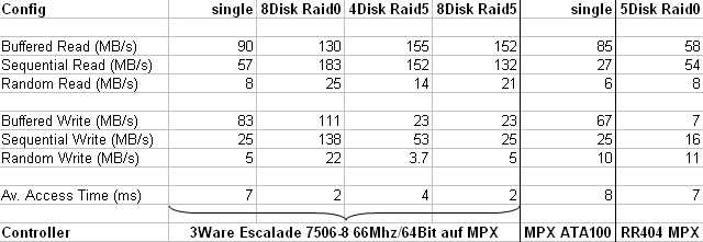 Ich hab mal mit meinem brandneuen und sauteuren 3Ware Controller ein paar Vergleiche bei verschiedenen Konfigurationen gemacht. Festplatten waren jeweils Maxtor 120GB ATA133 mit 8Mb Cache, Mainboards jeweils ein auf dem MPX Chipsatz basierendes Dual AMD Mainboard.