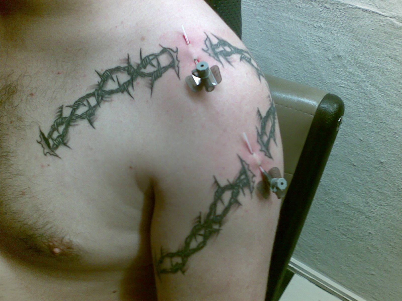 mein tättowierer meinte, dass er da bezgl. schatten nix mehr machen würde, da es sonst zuviel wär und der stacheldraht selbst nicht mehr zur geltung kommen würde. was man auf den schlechten bildern leider zu wenig sieht, sind die weissen effekte im draht selber welche den draht sehr plastisch wirken lassen. werd bei gelegenheit mal anständige bilder machen...