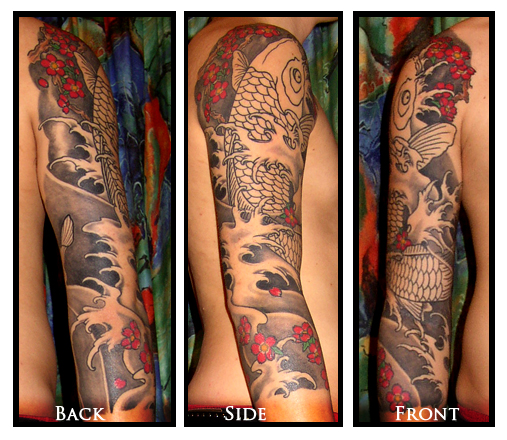 Ich wollte schon sehr lange ein Tattoo (ich glaube mit 16 fing das an) und habe mir das Jahrelang durch den Kopf gehen lassen. Zu guter letzt habe ich mich für die japanische Kunst entschieden, nämlich ein 3/4 Sleeve mit einem Koi und Kirschblüten. Ich habe mir danach 1 Jahr lang Motive und europäische Tattoo-Künstler angeschaut und mich für jemanden entschieden, die per Zufall in Deutschland, nahe der schweizer Grenze ab und zu als Gasttättowierer tättowiert! Wäre auch nach Stockholm oder London, keine Frage. Bisher hatte ich 4 Termine an je 3 Stunden. Der Koi wird noch farbig und einige übergänge müssen noch ausgebessert werden.