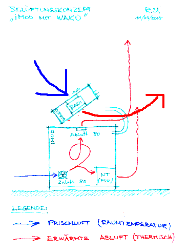 Ja das mit der Belüftung ist so eine Sache also ich gehe immer nach dem Prinzip, dass die Wärme steigt und so würde ich halt den Lüfter saugend auf dem Radi anbringen. Wäre für mich bei deiner Konstruktion logischer.
