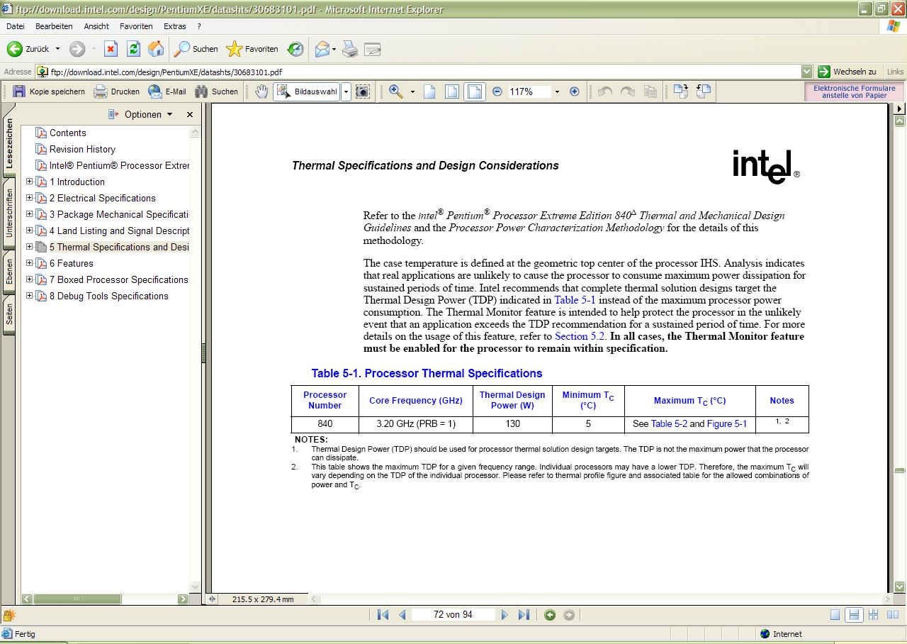 Für den Pentium Extreme Edition 840 gibt Intel einen TDP-Wert von 130 Watt an.