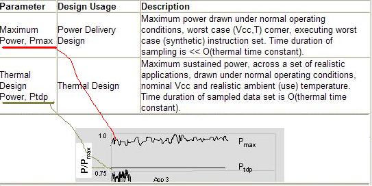 Intel further states "Processor power dissipation simulations indicate a maximum application power in the range of 75% of the maximum power for a given frequency."