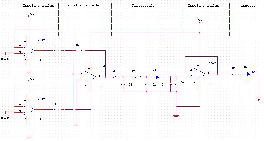 also...die ersten 2 ops summieren die eingänge (stereo)...beim 3. op bin ich mir nicht mehr ganz sich...danach kommt der tiefpass, welcher nur die tiefen frequenzen durch lässt...dann wird das ganze noch gleichgerichtet...und zum schluss noch integriert, damit's nicht so hektisch flackert...