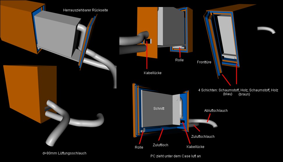 • Ich hatte mal die Idee das Gehäuse noch leiser zu machen, indem ich einfach nochmal ein Gehäuse um das jetzige gehäuse baue, da ich das jetzige Gehäuse behalten will und ich so für LANs und zum umbau des PCs keine probleme habe