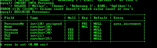 Da du noch die Spalte ID hast und nur fünf Argument mitgibst aber eigentlich sechs Spalten kann er den Command nicht ausführen.