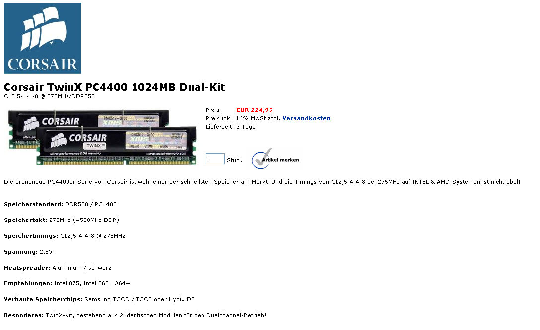 1GB Corsair TwinX1024-4400C25 (CL2.5@275MHz!) VP: 300.- inkl.