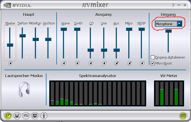 der sagte mir aber das wenn ich das Mic einstelle er auch den BF2 sound hört... dann sagte er mir wie ich das austellen kann und zwar so: Start -> Systemsteuerung -> Sounds und Audiogeräte -(nuese fenster) > Unter der Kategorie Lautstärke auf Gerätelautstärke und dort auf Erweitert -(kommt das zeugs da mit den Volumen SOund In/Output uns son COnfig hald kennt ja jeder) (Lautsärkeregelung) -> Dort auf Optionen und auf Eigenschafte -> Aufnahme ankreuzten oder wählen -> dann kommt da so Mono Mix, Stereo Mix, AUX usw.. das häcken ist bei Stereo Mix der Panzi saghte ich muss es auf Mikrofon wächseln das häcken aber das geht nicht ich kann es tausenmal an tippen nix geht
