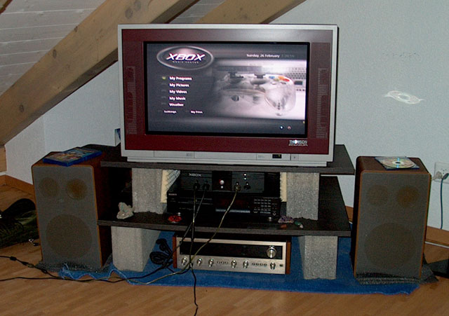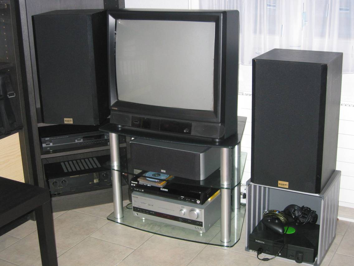 Hier mein Setup mit leider nicht idealer Lautsprecher-Positionierung und einem Krüppel-TV :kotz