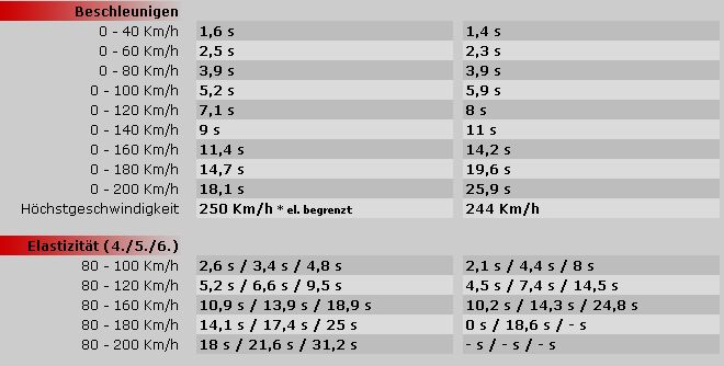 Ich habe keine Ahnung woher du die Zeiten hast. Ist das ein 0-200 Spurt, wo die einzelnen Bereiche auseinander genommen wurden, oder sind das sowas wie Durchzugsmessungen ohne Schaltvorgänge?