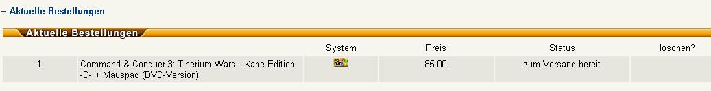 Wir erwarten die Lieferung des Spiels C&C 3 Kane Edition nächsten Dienstag für den Versand. Daher wird das Spiel am Dienstag per A Post verschickt. Der Ladenverkauf erfolgt dann einen Tag später. Der Lieferstatus wurde aber in Ihrem My WoG Account bereits jetzt angepasst, da wir die Rechnungen vorddrucken. Das warten hat bald ein Ende...