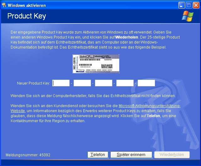 ''Der eingegebene Product Key wurde zum Aktivieren von Windows zu oft verwendet''