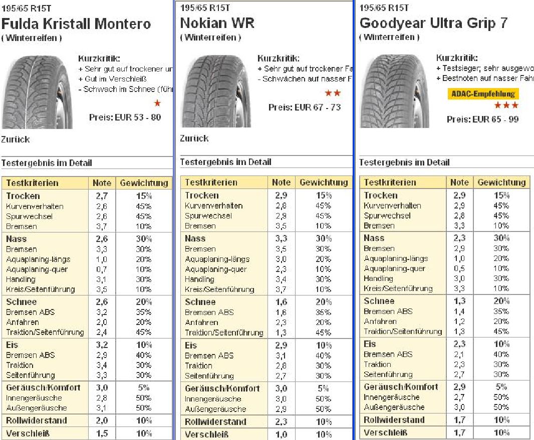 Dann ist es aber höchste Zeit, dass Du mal einen Spitzenpneu (Goodyear, Conti, Pirelli, Dunlop) probierst - die Fulda und Nokian sind zwar nicht schlecht, rangieren aber immer irgendwo im mittleren bis hinteren Mittelfeld oder gar gegen den Schluss - und zwar jedes Jahr und in allen Dimensionen von 165/70-14 - 205/55-16 ;)