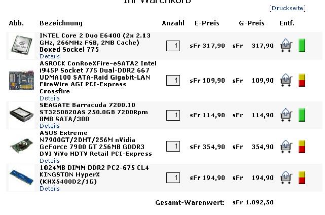 Also ich würde dir ein E6400 empfehlen, ein billiges Board, 1GB Ram, vielleicht eine 7900GS oder eine X1900GTO, und ein Raid0 mit zwei kleinen Hitachi-Platten der neusten Serie.