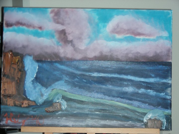 Als ich zu Hause war habe ich dann die Leinwand aufgestellt und sauber den Himmelteil mit einer Mischung aus Titanium-Weiss und Leinenöl bepinselt, als Liquid-White-Ersatz, den Ozean-Teil mit ungemischtem Leinenöl. Leider hatte das absolut nicht den Effekt, den ich haben wollte, denn das Leinenöl trocknete sehr schnell auf der Leinwand und somit war nichts mit „Nass in Nass“. Trotzdem habe ich mit den falschen Utensilien einfach mal experimentiert und einfach mal probiert. Mit dem Ergebnis bin ich gar nicht mal so unzufrieden, zumal ich noch nie in meinem Leben gemalt habe und ich einfach mal ausprobiert habe. Vorallem der Himmel und die Gischt sind mir glaube ich nicht schlecht gelungen.