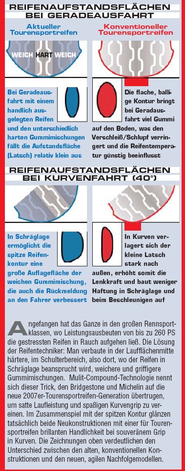 Sehr interessant ist das mit der Reifenaufstandsfläche bei den aktuellen Tourensportpneus: das würde erklären, warum die eben sogar bei gleichem Gummi an der Flanke besseren Grip in der Kurve bieten können, z.B. eben der Pilot Road 2: