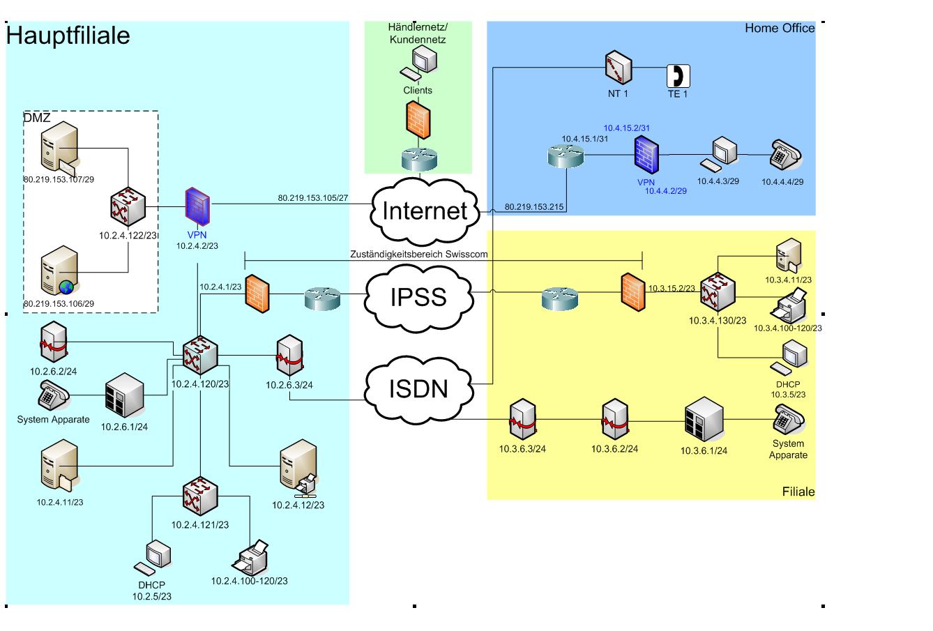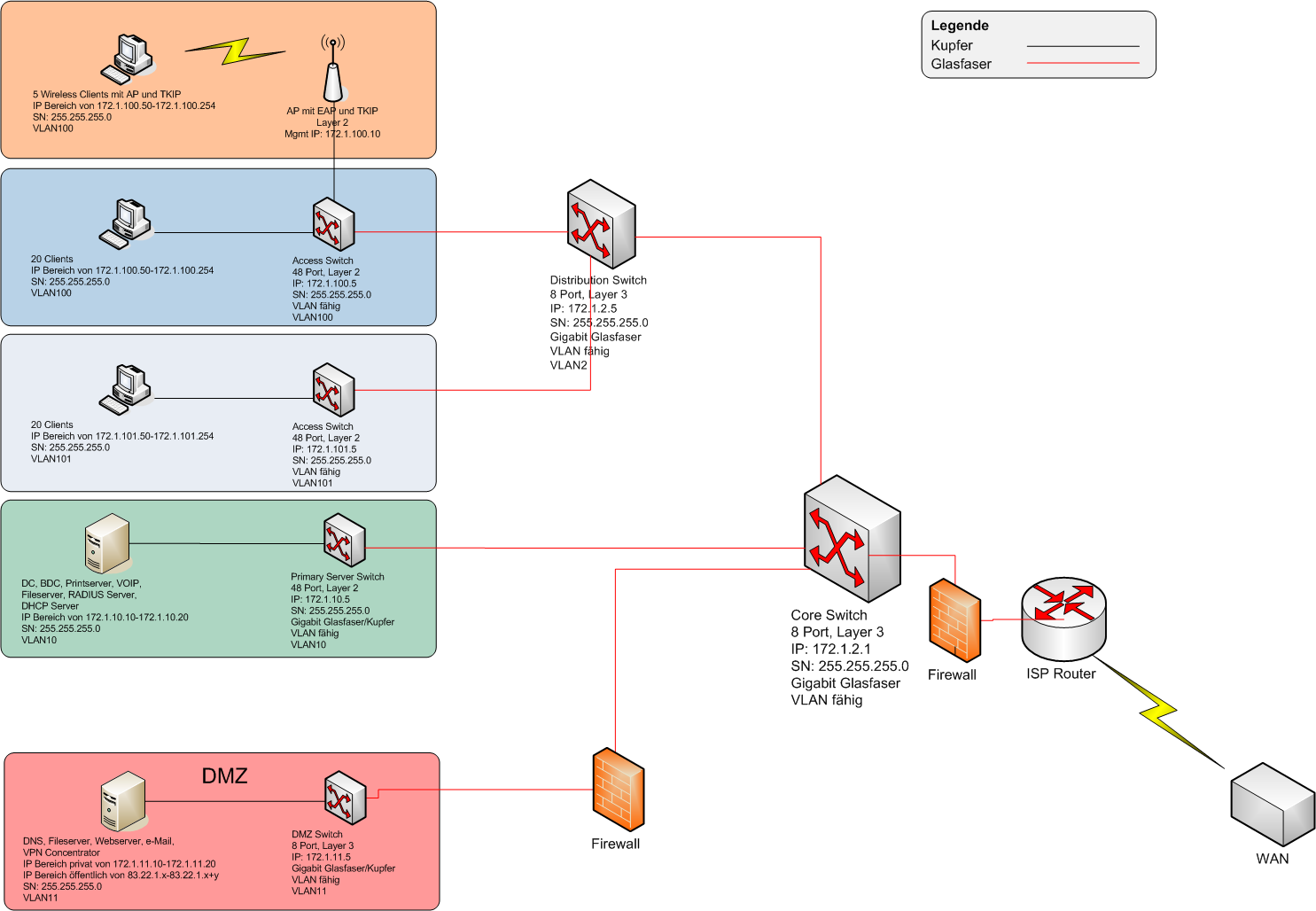 - Es fehlen noch Routen, sonst koennen die einzelnen Netze ja gar nicht ins WAN, resp in andere Netze (Clients->Drucker) , die wuerd ich auch gleich bei den entsprechenden Switches (falls du nicht noch Router einzeichnen willst.) hinschreiben.