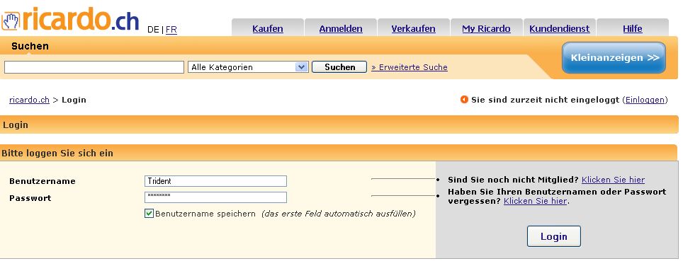 Bei Ricardo sieht's so aus (beim Passwort schon Sternchen drin, so kann ich nur login drücken.