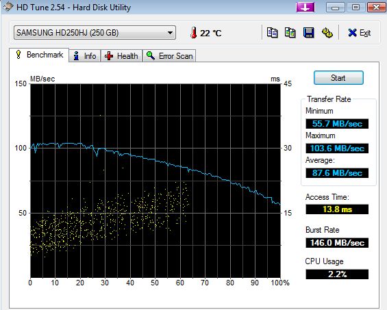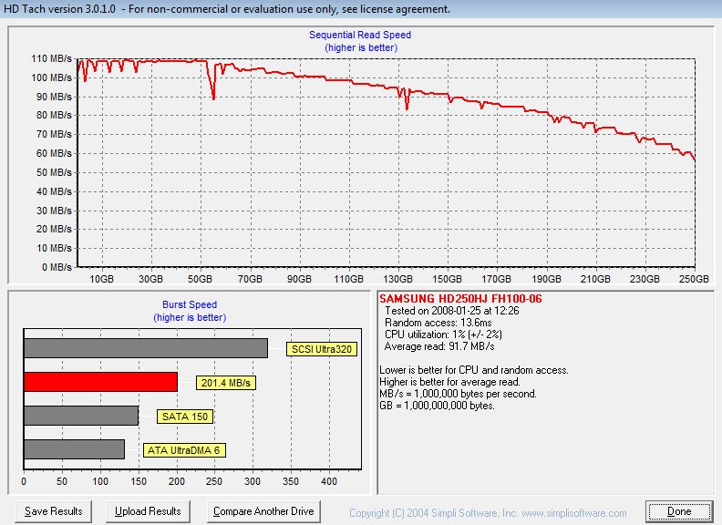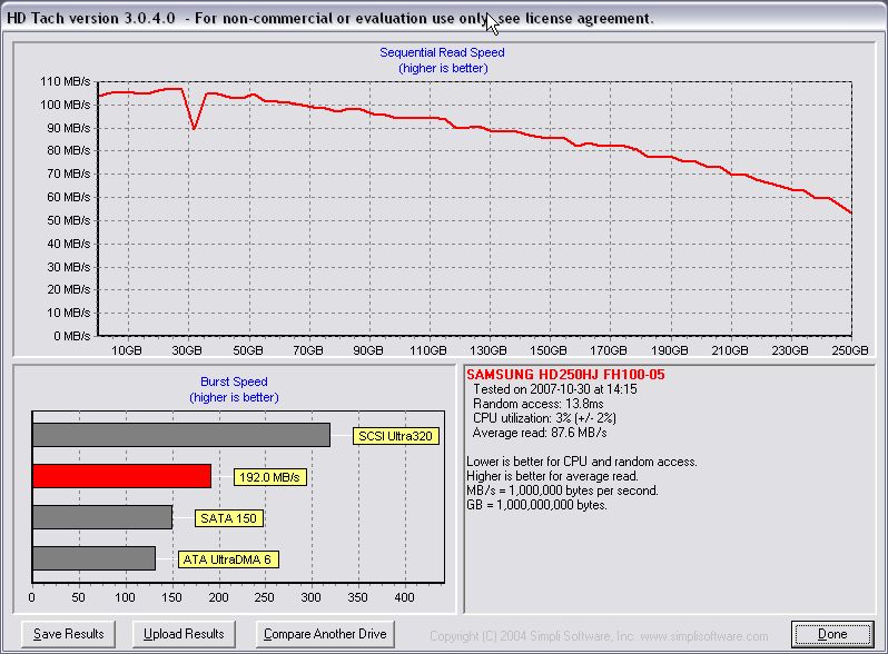 Hast Du die Transferleistung schon nur einer einzelnen S250 angesehen? Siehe unten! Auf den ersten 74GB ( :P) immer 100MB/s und mehr!