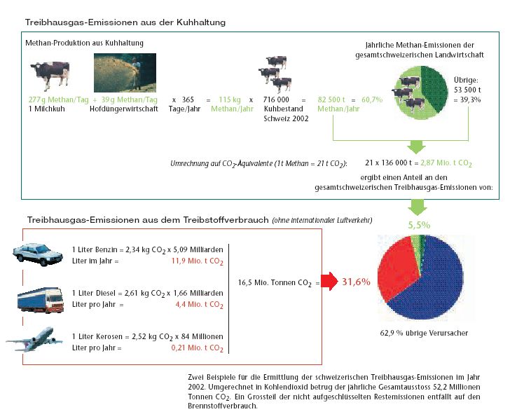 716000 Kühlein und die dazugehörigen Bauernhöfe usw. machen 5.5% des Kompletten schweizer CO2 Ausstosses aus. Der komplette Verkehr mit sicher deutlich mehr als 700'000 Autos + Luftfahrt (nicht international)+ Transport macht 31.6% aus.