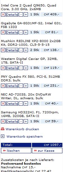 EDIT3: Die 320GB-HDD wäre optimal fürs OS und Programme. Die fette TB-HDD für Daten wie Videos, Bilder, etc. Beim Mainboard kannst du natürlich auch etwas anderes nehmen. Mehr als 120.- würde ich jedoch nicht ins MB investieren. Je nach Overclockingwissen könntest du auch auf eine kleinere CPU (z.B. Q9550) zurückgreifen und diese dann um ein paar 100MHz übertakten. So 3,2GHz liegen sicher drin.;)