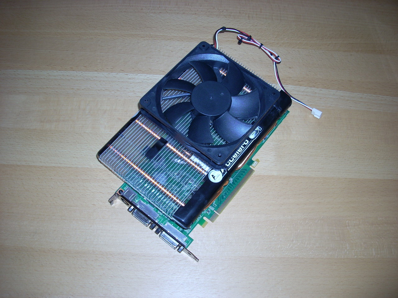 Sie ist mit einem Accelero-S1-Kühler und einem 120mm-Lüfter ausgestattet.; dadurch wird die Karte selbst im 3D-Betrieb nicht heiss und ist absolut unhörbar.