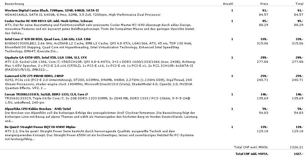Ich möchte von Euch wissen, ob diese Komponenten so zusammenpassen und ob Ihr irgendwo eine massgeblich bessere Alternative kennt ("besser" im Sinne von "preisgünstiger bei vertretbarem Leistungsverlust"). Antowrten wie "passt so" sind gerne gesehen, wenn es denn wirklich passt ![]()