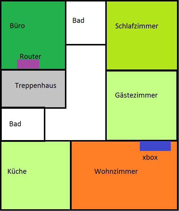 Habe unten mal ne ultimative Paint-Skizze von der Situation angehängt (Die Farben sollten den ungefähren Empfang anzeigen, aufm Balkon beim Wohnzimmer ist der Empfang fast auf 0).