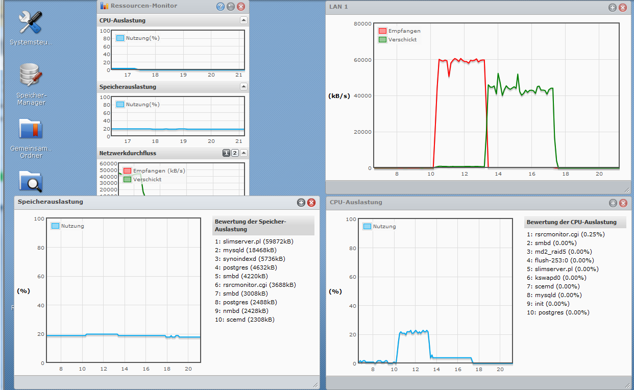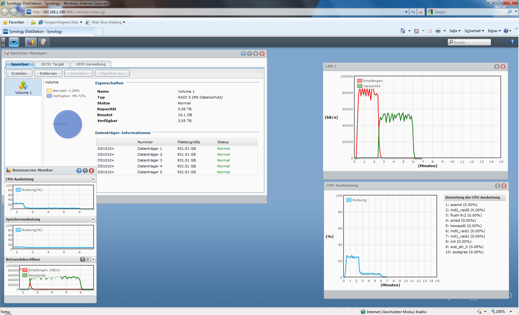 Ich habe zuhause als NAS system (RAID5) eine DS1010+ welche im RAID5 bis zu 100MB/s lesen/schreiben sollte.