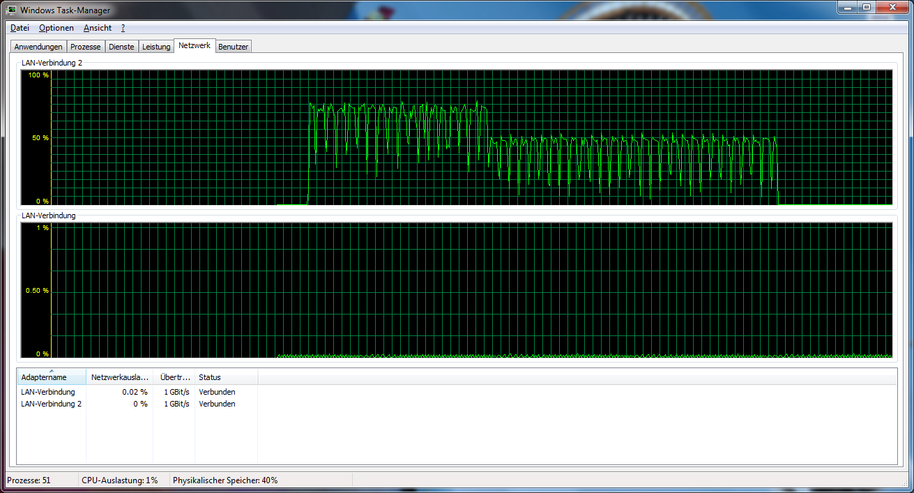 Als Kabel wird vom NAS zum Switch ein 3 Meter Cat5e kabel eingesetzt, vom PC zum Switch ein Cat5(e) Kabel mit selbt gecrimpten stecker (sollte aber OK sein). Das Kabel vom PC zum Switch verläuft entlang des Stromkabels vom PC (3x1,5mm2, ca. 150W)