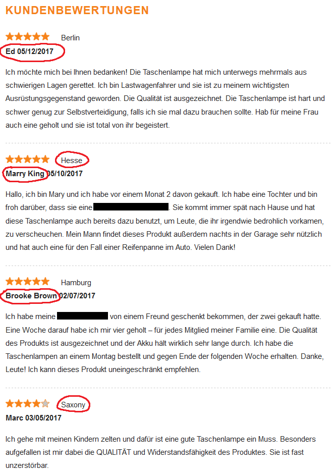 Und als ich Werbung für ne Taschenlampe sah, wusste ich nicht, ob ich nun lachen oder heulen sollte. Typisch Deutsche Namen, jaja. All die Kundenbewertungen hat wohl der Praktikant schreiben müssen. Mit einem Prospekt der Taschenlampe in der Hand. Und der gute Ed hat die Taschenlampe im Dezember 2017 gekauft/bewertet? Im Dezember! ![]()