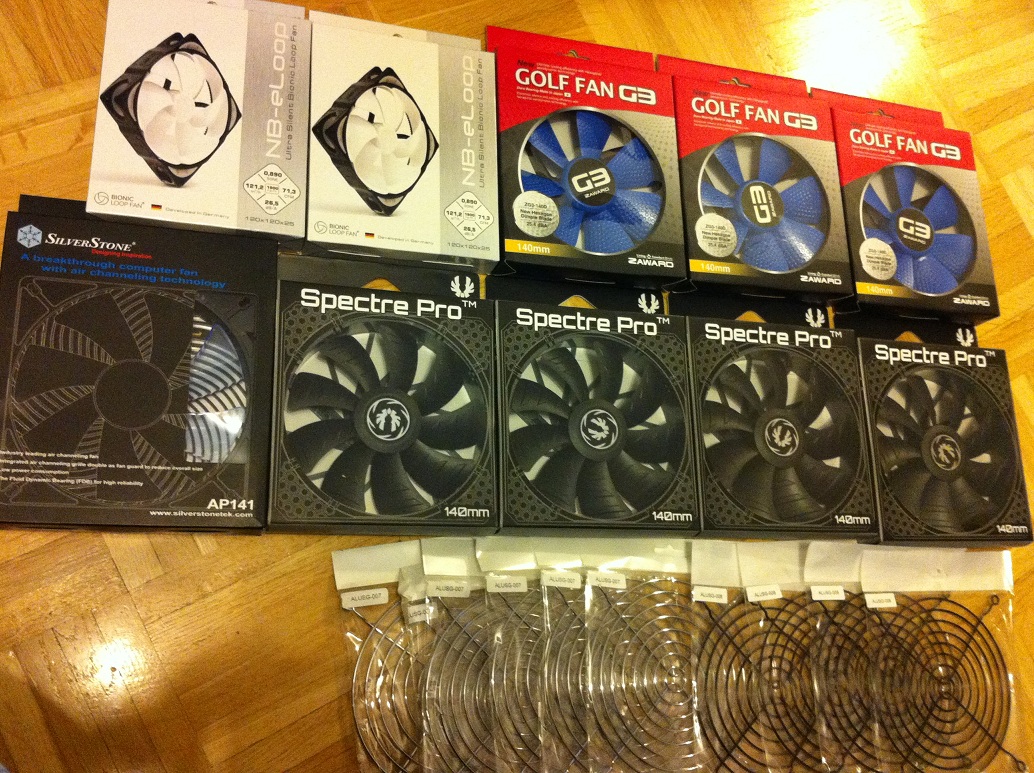 • ausserdem ist letzten Dienstag die Lieferung von PC4all gekommen. hab angefangen, die neuen Lüfter miteinander zu vergleichen. gekauft hab ich u.a.: