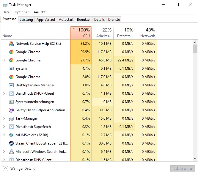 • NetworkServiceHelp (32bit), welchem Programm kannst du das zuordnen (mach mal rechtsklick drauf und dann "Dateipfad öffnen") ? Das braucht verdächtig viel CPU.
