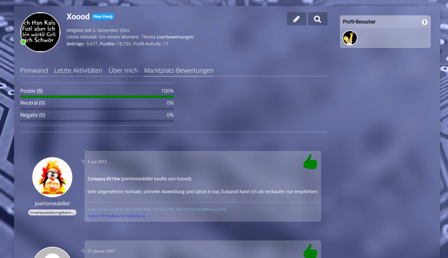 • Der Read-Only Teil der Userbewertungen ist nun im Forum eingebunden. Die Zahlungsart wird bei Gelegenheit noch hinzugefügt. Öffnet dazu einfach das User-Profil des Users und ihr findet ein neues Tab mit den Bewertungen. So ist es schön im User-Profil versorgt und eine Liste mit Such-Funktion ist dadurch überflüssig.
