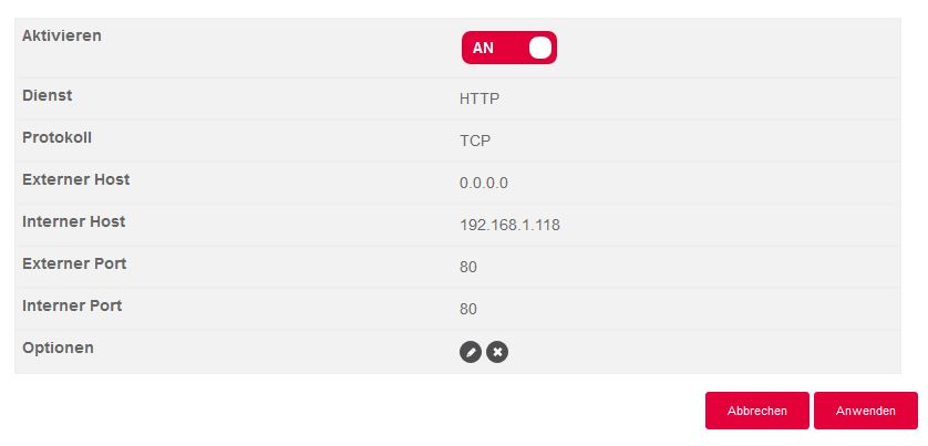 Habe also bei meinem Sunrise Router alle remote hosts port 80 auf 192.168.1.118 port 80 geroutet - zumindest denke ich dass ich das habe - funktioniert aber nicht.