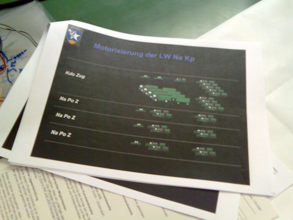 In der 3. Woche fand eine Übung zusammen mit der Inf Brig 7 statt. Sind das Nieten dort. Wir von der Luftwaffe sollten denen eigentlich unsere Dienstleistungen, also die Nachrichtenauswertung, anbieten, aber die Zusammenarbeit hat offensichtlich nicht so rosig funktioniert. Einmal kamen noch Markeure von einer anderen Truppe und haben bei einem Anhänger die Luft abgelassen. Dies ging definitiv zu weit ![]()