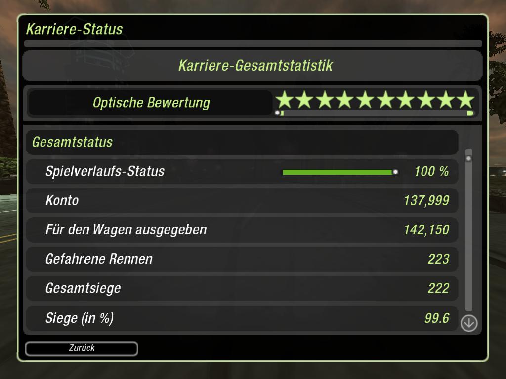 Ich habe alle Rennen gemacht, sei es die Cheep rennen (Orange) oder andere Drift, Drags usw die gar nicht eingezeichnet waren, einfach alle versteckten Rennen. Dann habe ich mich mal auf die Bewertung der Optik gekümmert. Habe dann festgestellt dass mir noch Sachen fehlen...