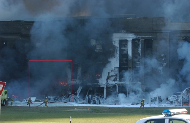 Hier sieht man schon mal: Keinerlei Trümmer von einem 60 Tonnen Flugzeug, der Schaden ist gerademal im Erdgeschoss, der Rasen ist komplett intakt.