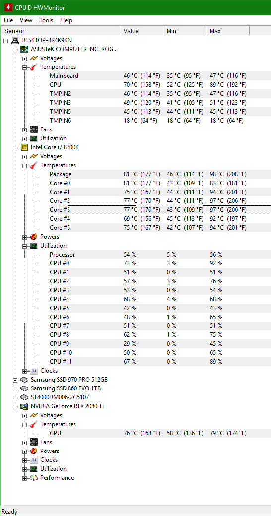 Idle + im Browser in paar Vidoes schauen: 30° - 57°
