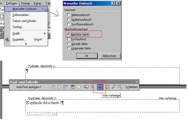 Bei Kopf- / Fusszeilen ist die Funktion "mit vorherigen verknüpfen" grau, was bedeuten müsste, dass sie nicht verknüpft sind, aber sie scheinen es doch zu sein.