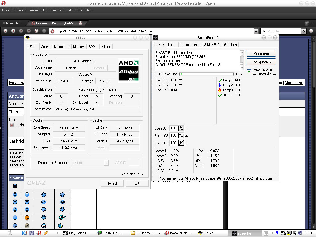 CPU Fan raus, neue Leitpaste draufgestrichen und alles schön entstaubt!Jetzt läuft er auf 166MHz FSB mit 1830 MHz CoreSpeed bei standartmässigen 1.7V VCore.