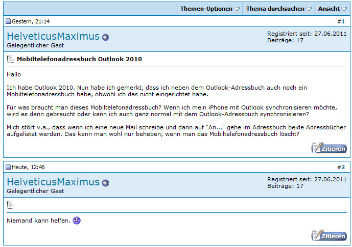 Was ich aber kacke dreist finde ist gestern ein Thread zu eröffnen udn Heute schon zu pushen mit "Niemand kann helfen" dies vorallem dann noch in beiden Foren. Vielleicht find ich noch mehr !