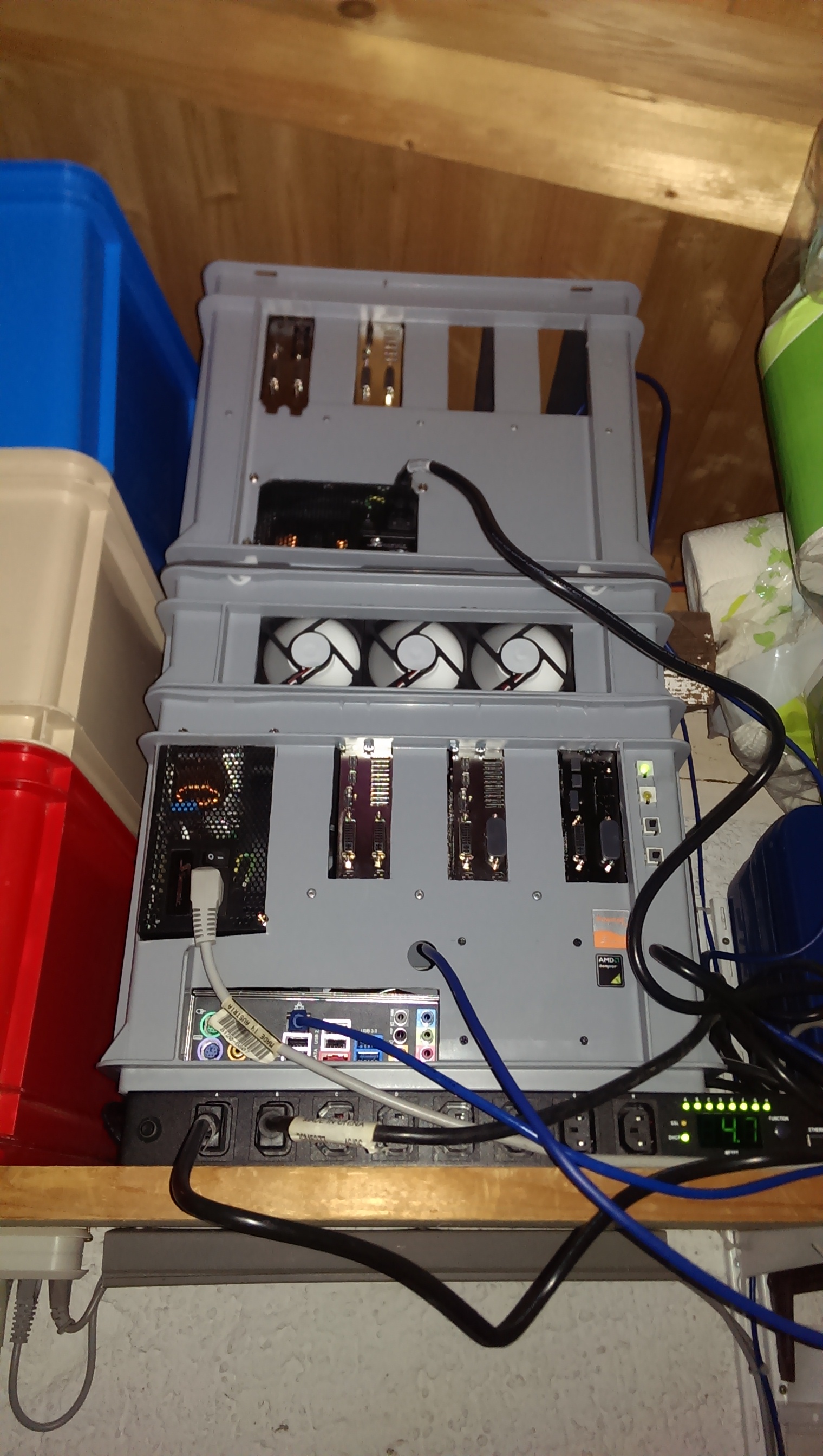 Ja genau, ich habe meine bisher drei Karten alle über Riser-Kabel angeschlossen. Das ganze habe ich in eine Rako-Kiste gebaut... Wenn alles klappt kann ich die Kisten sogar stapeln