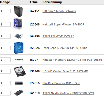 Ein Bekannter von mir hat mir einen PC zum zocken zusammengestellt. Wegen Ram muss ich noch schauen, hätte lieber 2x4GB statt 4x2GB damit ich bei Bedarf mal aufrüsten kann. Und die Graka wird auch keine Asus sondern eine Zotac.